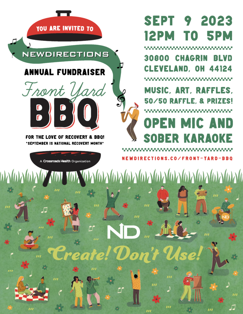 Join us for Front Yard BBQ: “Create! Don’t Use!” on September 9, 2023 from 12pm-5pm at New Directions.
