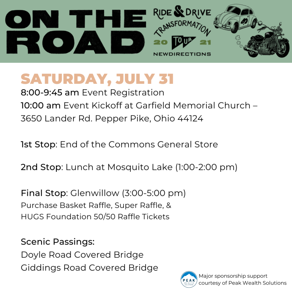 The scenic car tour will be organized along a route in Northeast Ohio, starting at Garfield Memorial Church – 3650 Lander Rd. Pepper Pike, Ohio 44124. From two to four wheels, all are welcome to join in the fun! We’ll be stopping at special designated sites along the tour route. Stops, in order, will be End of the Commons General Store, Mosquito Lake (lunch included), and Glenwillow. Each stop will have one or two unique backdrops to enjoy. The final stop at Glenwillow will also include basket raffles and a HUGS Foundation 50/50 raffle! You don’t need to attend to win the Super Raffle prizes (winners announced on our Facebook page on Sunday August 1 at 1pm) but you do have to be in-person on July 31 to participate in the basket and 50/50 raffles.